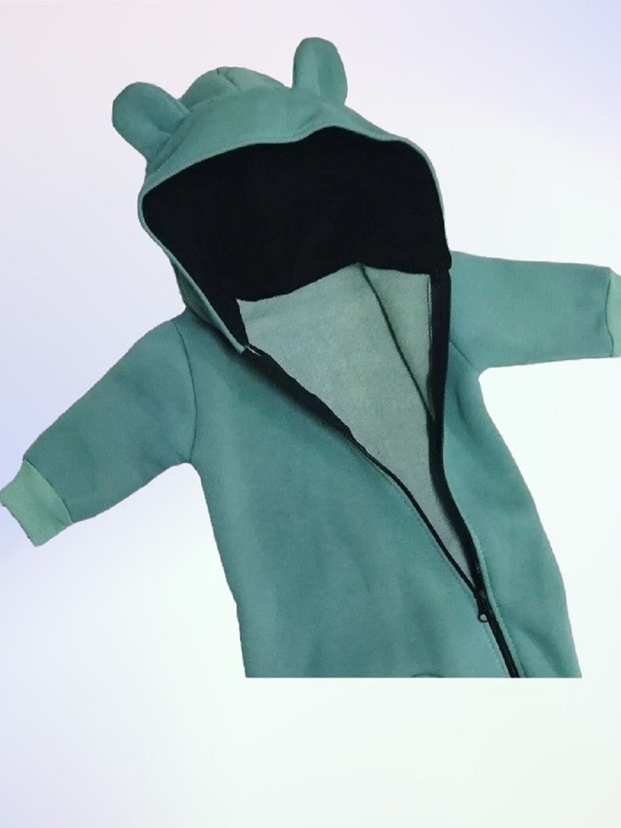 Комбинезон с закрытыми ножками, с капюшоном на подкладке, на молнии по всей длине и до конца одной ножки.