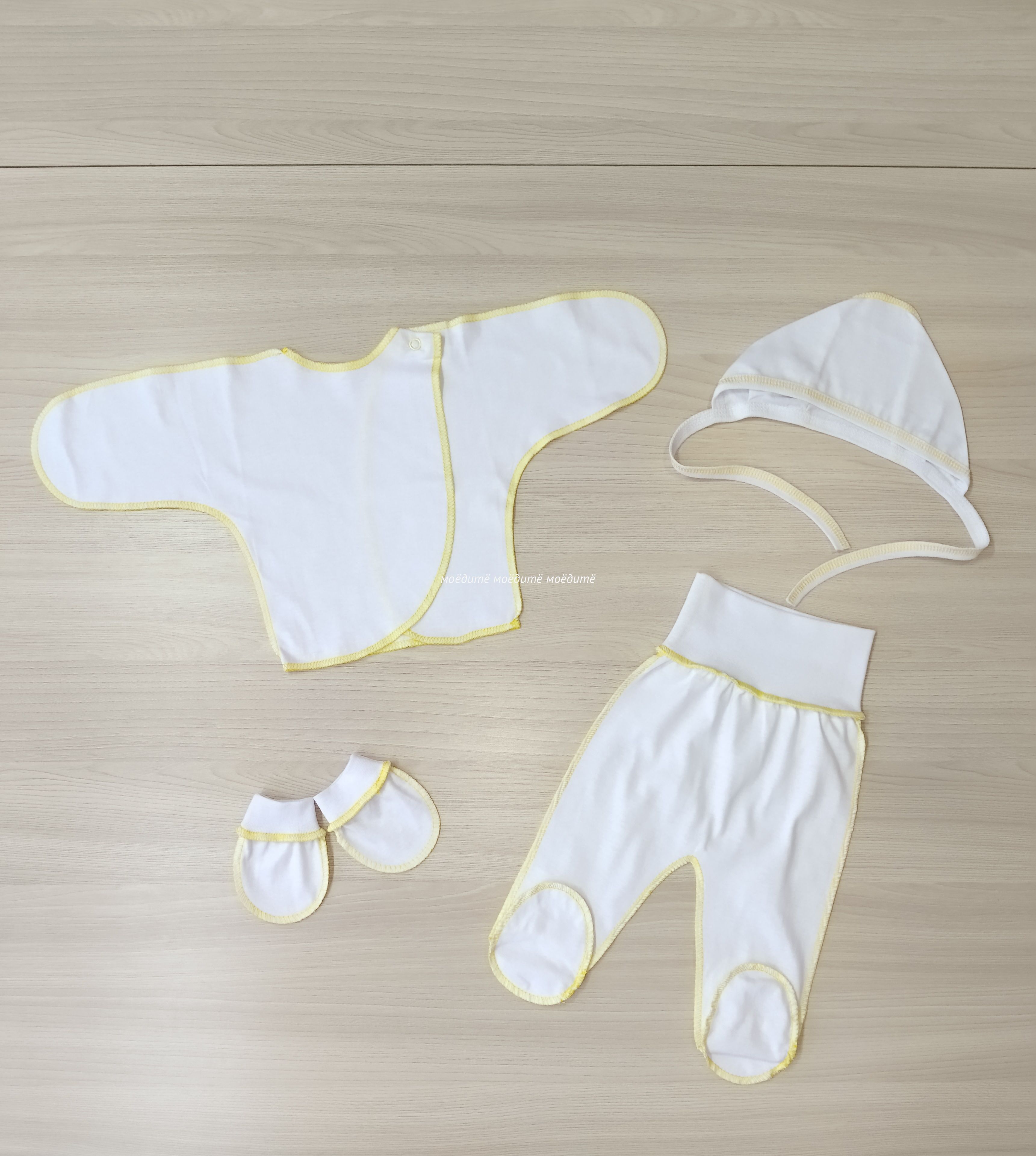 "МоёДитё" комплект на выписку из 4-х предметов белый + жёлтый КП025 "Магнолия"